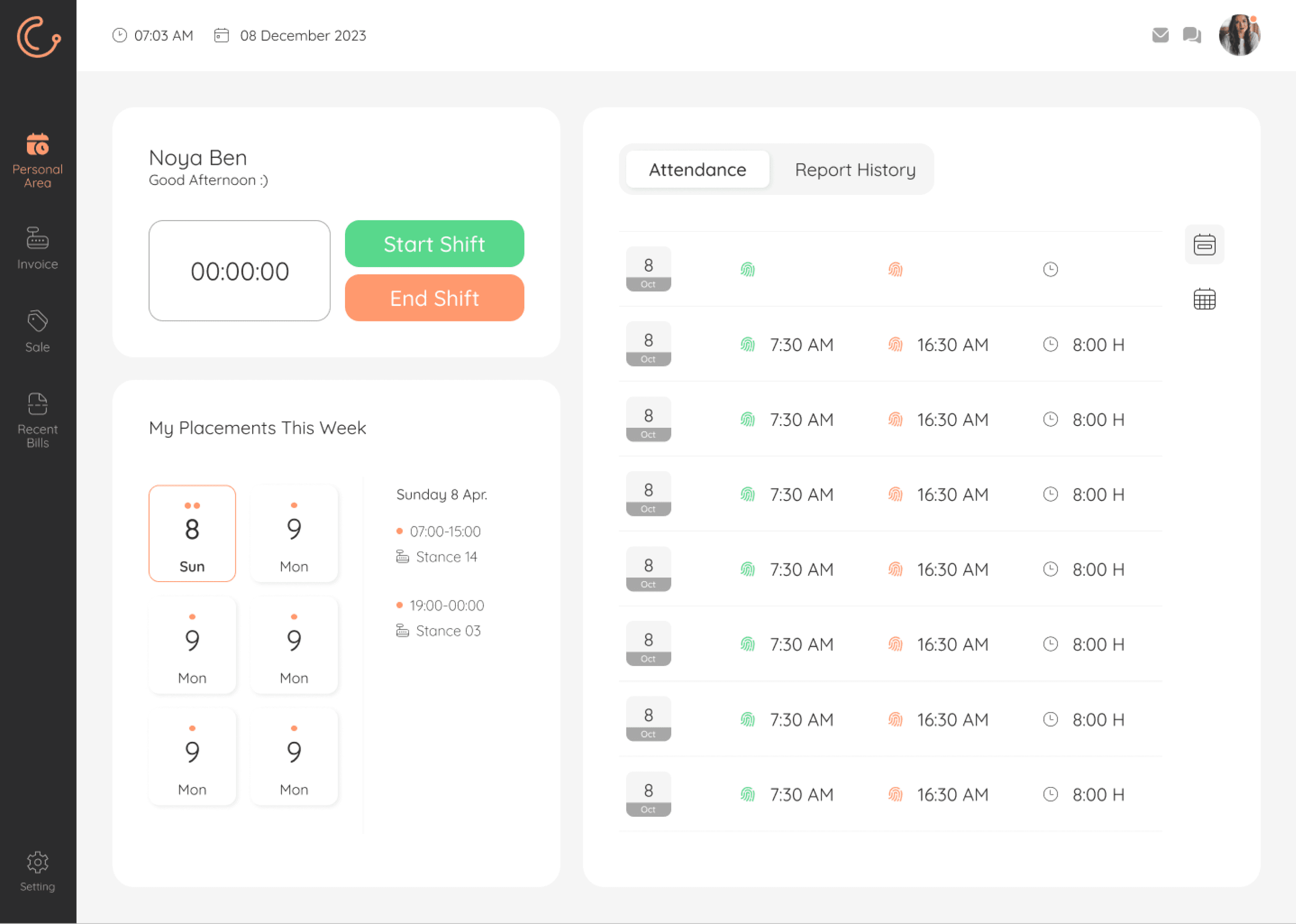 Allowing the user to report attendance, track his personal shift schedule, view shift end reports.