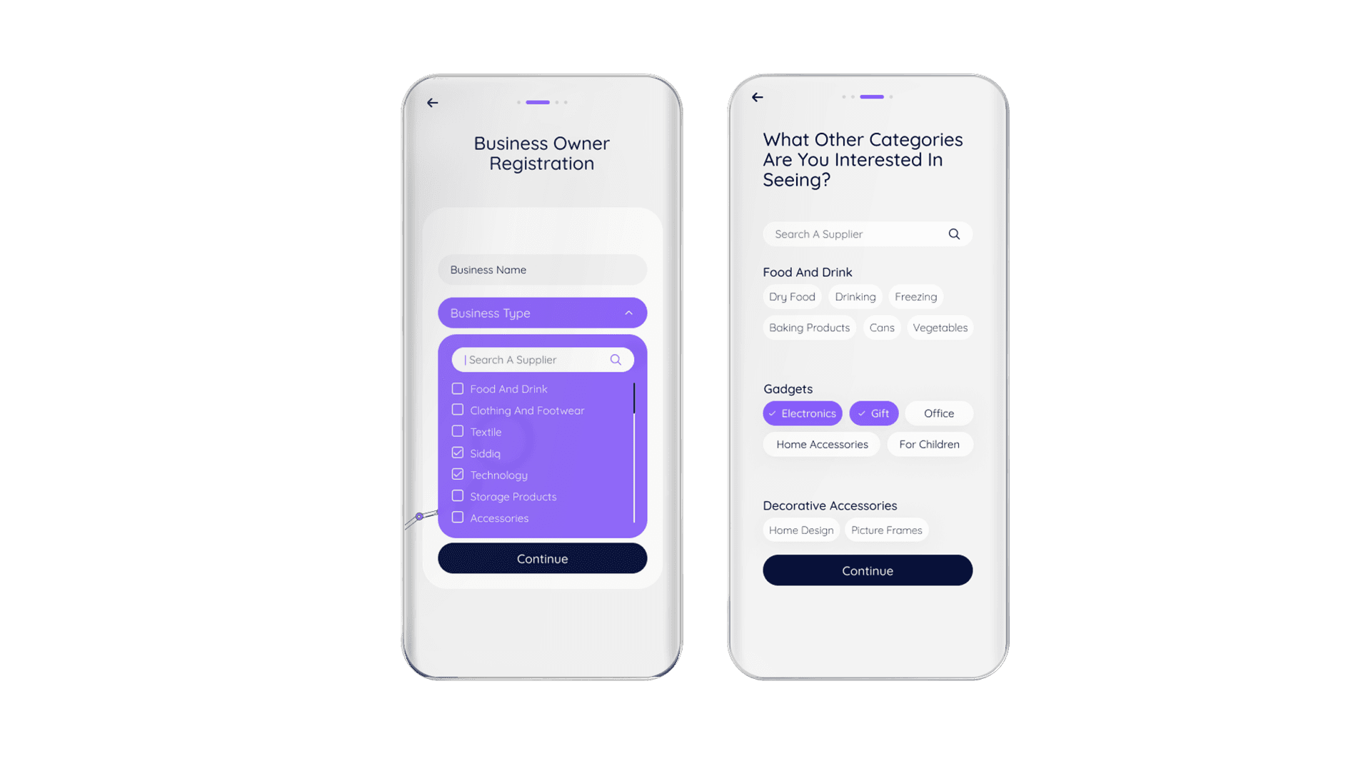 Selection of the business category and the option to add additional categories based on the user's interest in finding suppliers in those specific fields.
