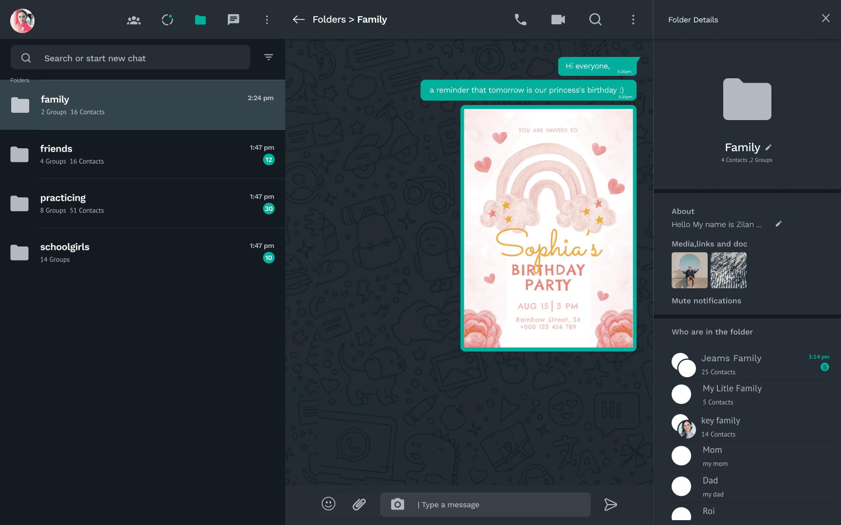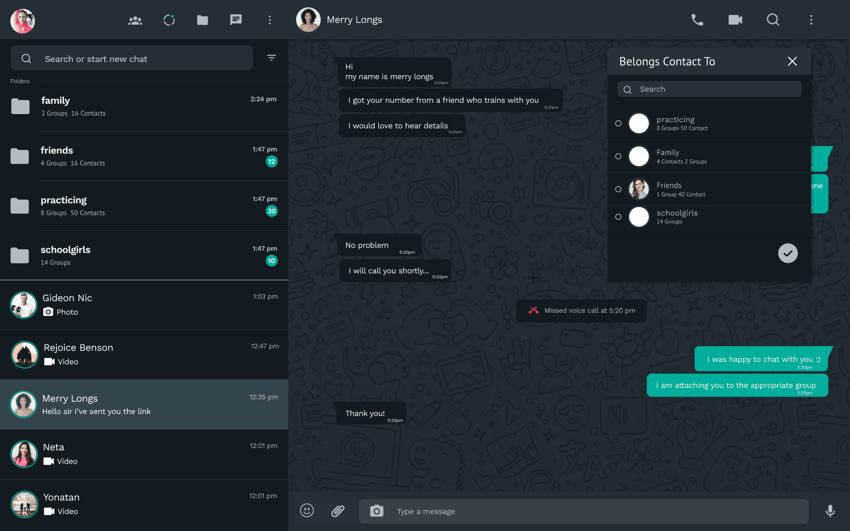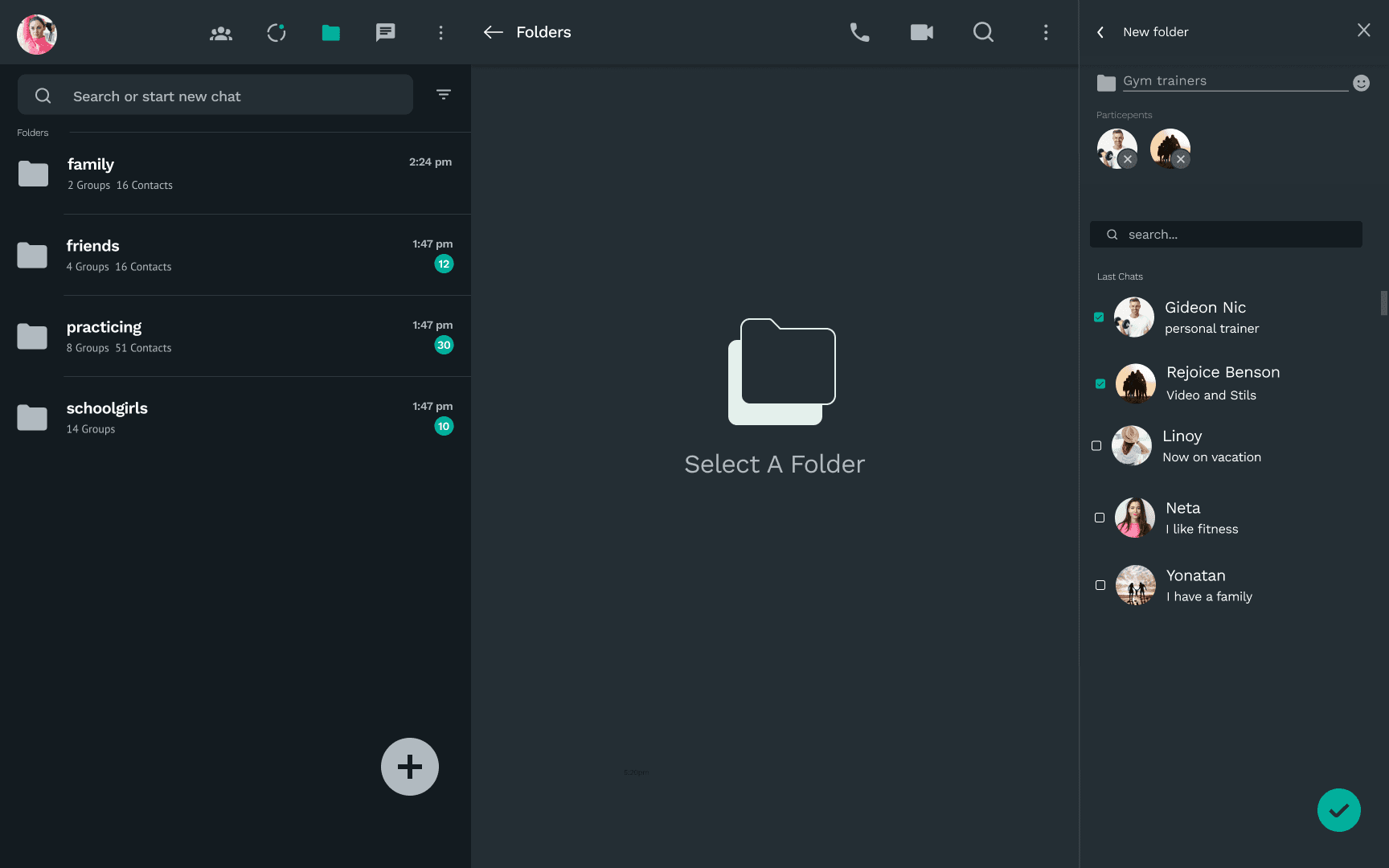 As a busy trainer and creator of content for her many groups, she wants her WhatsApp contacts to be organized in folders by training groups.